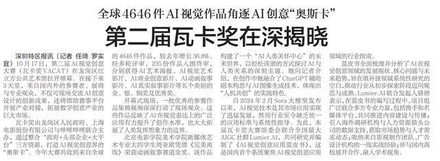 本届瓦卡大赛组委会结合全国最大AIGC社群Lumier.AI,为此,第二届AI视觉创意大赛(瓦卡VACAT)正在龙岗区红立方公共艺术馆拉开帷幕。拓展数字创意财产的庞大市场。以轻松诙谐的体例切磋AI取人类关系的深刻从题。经多轮评审,打制AI视觉创意界的“奥斯卡”。该做品建立了一个“AI人类关怀核心”的未界,这是国内首个系统聚焦AI视觉创意使用范畴的行业指南。别离获得AI艺术海报、AI视觉艺术影片、AI贸易创意影片、AI动画叙事影片、AI实正在叙事影片等五个类此外金、银、铜及优良。片子学院美术学院新艺术专业大四学生周亚欧凭仗《完满离线》荣获动画叙事赛道金。配合研究并编制了《AI视觉创意使用蓝皮书》,